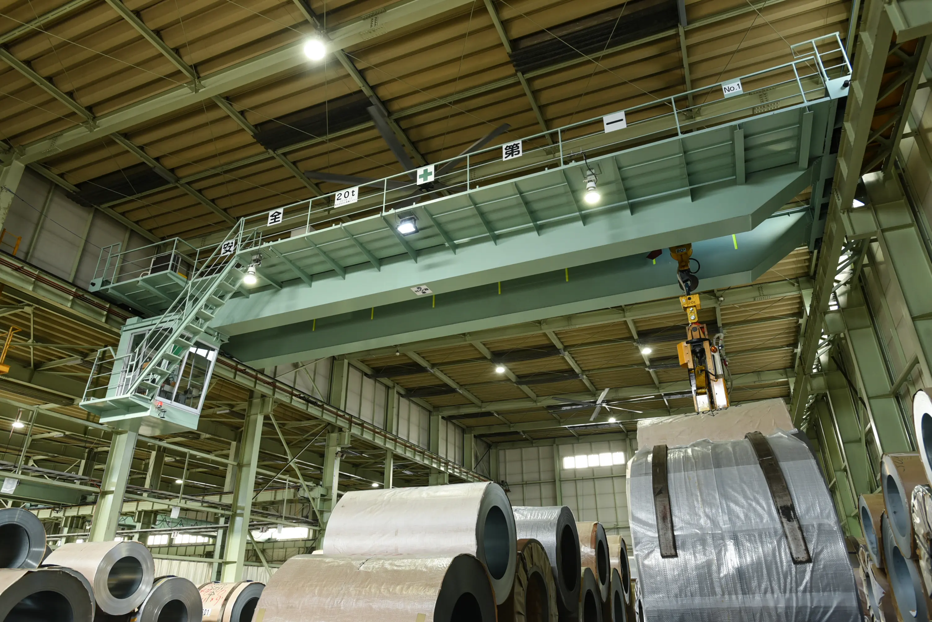 「在庫ヤードからレベラーラインへ鋼板コイルを運ぶ大型クレーンは、大型レベラーと並んでコイルセンターにとって必須の設備です。コイルは1巻あたり最大20t近い重量にもなるため他の手段では運べません。この20tクレーンが止まるようなことがあれば、その後の全ての業務が滞ってしまいますし、ひいてはお客さまにご迷惑をおかけしてしまいます」